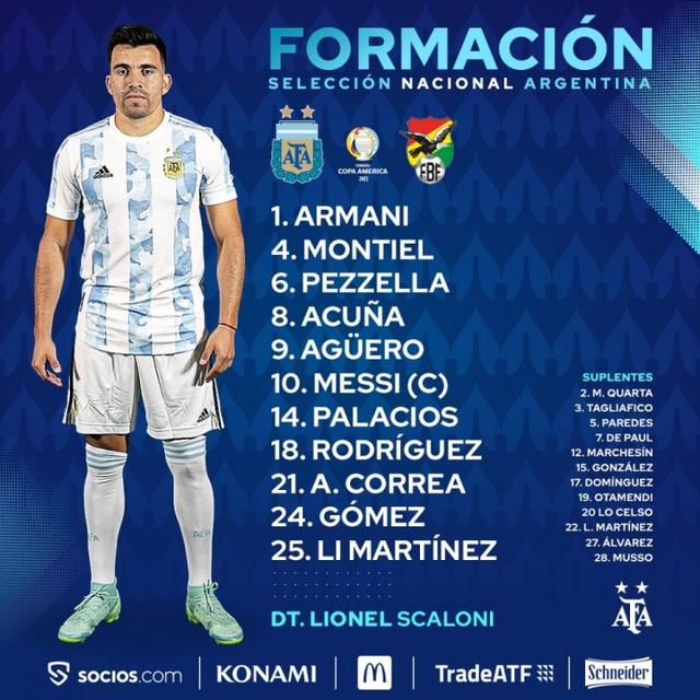 阿根廷首发:1-阿尔玛尼、8-阿库尼亚、6-佩泽拉、25-利桑德罗-马丁内斯、4-蒙蒂尔、18-G-罗德里格斯、14-帕拉西奥斯、24-戈麦斯、21-安赫尔-科雷亚、10-梅西、9-阿圭罗