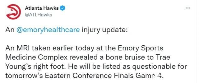 在老鹰与雄鹿的G3较量中,特雷杨脚踩到裁判脚上受伤,可他还是坚持打完了比赛。赛后特雷杨接受了核磁共振检查,结果显示:他的右脚有一处骨头瘀伤,明天比赛出战成疑(50%的可能出场)。目前老鹰1-2落后于雄鹿,如果特雷杨无法出战的话,那么系列赛也将彻底失去悬念。作为老鹰的绝对核心,特雷杨季后赛场均轰下29.8分9.5助攻,是球队能够打进东决的关键所在。