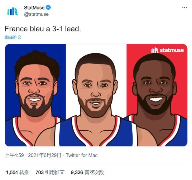 美媒Statmuse没有放过这个“3比1领先被翻盘”的机会,他们把库汤追三人P上了法国国旗的配色。