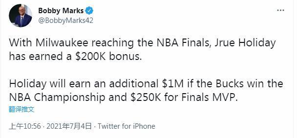 雄鹿杀进了总决赛,霍乐迪将对位太阳核心保罗,他攻防两端的表现依然非常关键。值得一提的是,根据薪资专家Bobby Marks报道,由于成功帮助球队杀进总决赛,霍乐迪将额外获得20万美元的奖金。另外,在总决赛里,如雄鹿能够成功夺冠,霍乐迪将可获得100万美元的奖金,同时,如果霍乐迪荣膺总决赛MVP,那么他还能再拿到25万美元。
