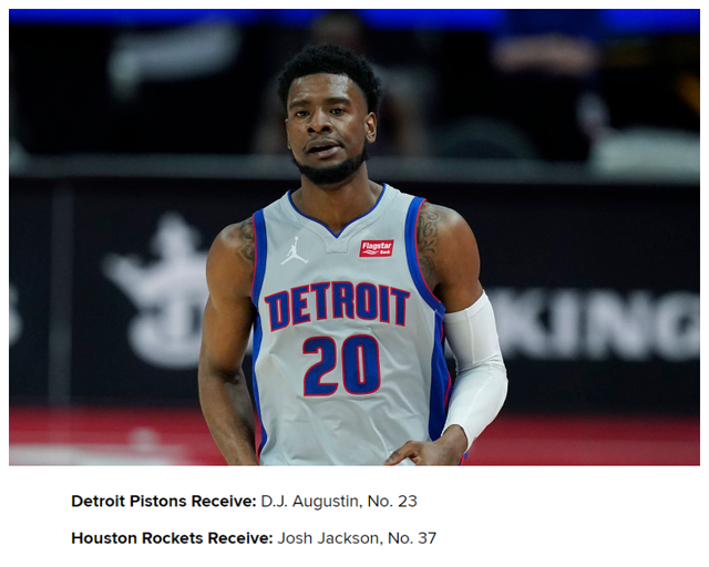 第二,火箭送出23号签和奥古斯丁,从活塞得到约什-杰克逊+37号签。这家美媒表示:火箭这样做交易赚到了。