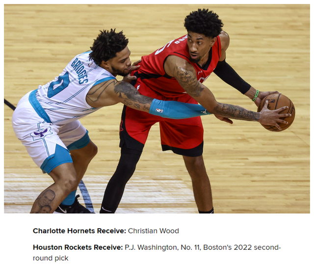 两套交易方案具体是这样的。第一,火箭送出伍德、从黄蜂得到PJ-华盛顿、2021年11号签、2022年二轮签。