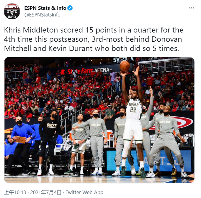 其中单节轰下23分,不仅创造了米德尔顿生涯单节得分纪录,也是米德尔顿本赛季季后赛,第4次单节砍下15+得分。