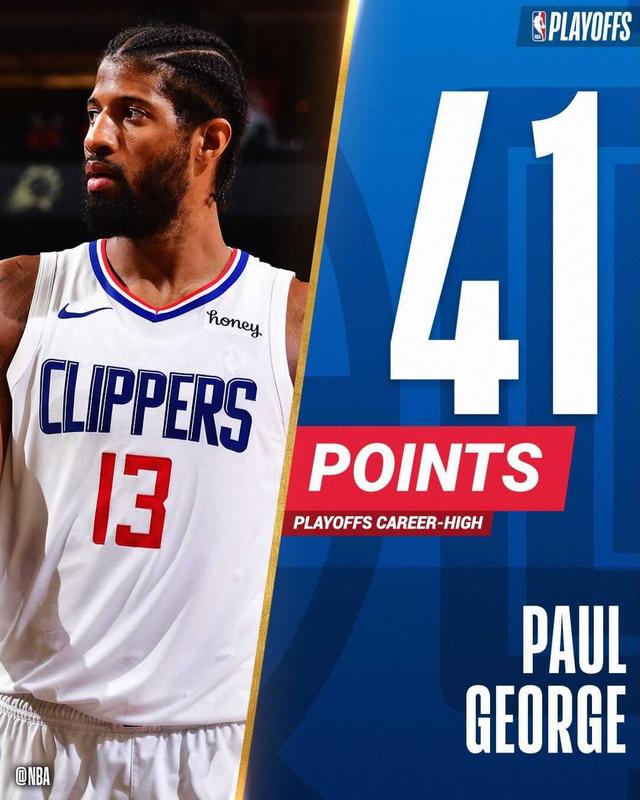 第二,41分创造了乔治的季后赛单场新高,此前这一纪录为39分。