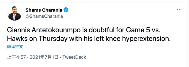 美媒沙姆斯-查拉尼亚表示字母哥在系列赛第5场比赛是出战成疑的状态,而扎克-罗威和沃纳罗斯基的说法是字母哥的复出时间表还是“未知数”: