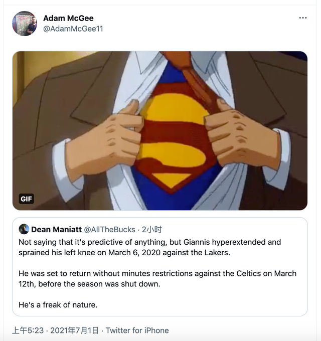 即便布登霍尔泽是这样的说法,但相信雄鹿还是会优先确保字母哥的膝盖伤病能得到最好的恢复。不过幸运的是,在遭受如此恐怖受伤方式的情况下,字母哥还是没有结构性损失已经没有遭受韧带上的伤病,这已经是足以体现字母哥的身体天赋和强壮程度,美媒安迪-贝勒和亚当-麦基更是称赞字母哥就是超人: