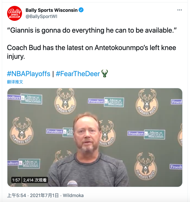对于字母哥的伤病情况,雄鹿主教练布登霍尔泽也透露自己所掌握的消息并且表示: