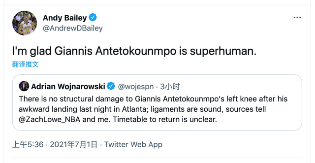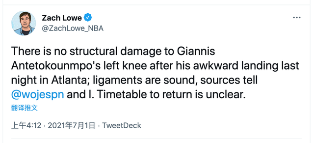 据ESPN记者扎克-罗威和阿德里安-沃纳罗斯基的说法,扬尼斯-阿德托昆博的左膝并没有受到任何结构性的损伤,而且他的“韧带完好无损”: