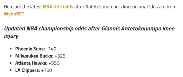 不过在字母哥受伤之后,雄鹿的夺冠概率也有明显下降: