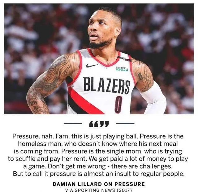 “压力?兄弟,这只是打篮球而已,压力不应该属于我们,应该属于那些无家可归的人,他们不知道下一餐在哪里。我们打一场比赛就能赚很多钱了,你们别搞错了。我们确实会遇到挑战,但是这不能称之为压力,因为这对于普通人来说简直就是侮辱。”