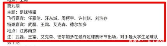 从节目名单中看到,第九期是足球类特辑,几名球员将在最终的足球环节中亮相,并且联手组队对阵大学生足球队。按照中超和国足的赛程来看,也许艾克森武磊等人只有未来几天的假期有空录制节目了。