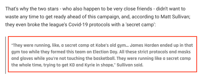 另一方面,据美媒马特-沙利文透露,杜兰特和欧文之间在赛季前曾进行秘密训练营,这是违反联盟健康协议的举动,他们在科比的旧体育馆内举办秘密训练营,甚至詹姆斯-哈登前往篮网后也曾去过那个体育馆。他们一直在进行秘密训练,这主要是为了让杜兰特和欧文尽快恢复状态,而联盟健康和安全协议所规定的是球员必须戴上口罩和手套: