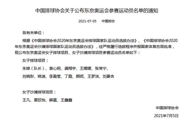 距离东京奥运会开幕仅剩17天,各支代表队也纷纷公布了参赛名单,其中中国女排受到了不小的关注,根据中国排协的官方公告显示,代表女排参赛的12名球员,分别是朱婷(队长)。袁心玥、龚翔宇、王媛媛、张常宁、刘晓彤、姚迪、李盈莹、丁霞、颜妮、王梦洁和刘晏含。