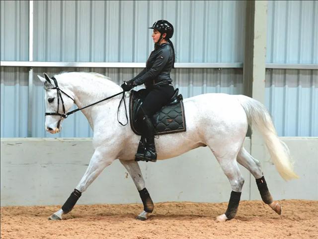 “首先在圈乘的过程中快步,或快或慢,” Lili说,“再次,对你的腿部辅助进行分级,从轻触开始,当你的马匹步伐开始变大时,由收缩快步变为中间快步,放松你的缰绳,让马可以走起来。”