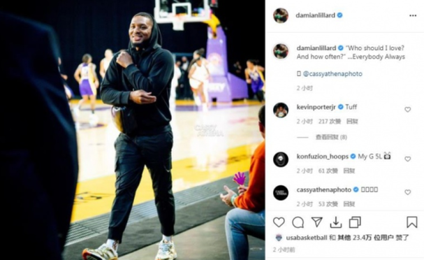 除了丁威迪,利拉德也是一直处在交易流言中,季后赛被淘汰后,他已经多次在社媒上隐晦的表达对球队现状的不满,就在今天,利拉德在社媒上再次发声,这一次更直接了,他写道:我应该爱谁?能爱多久?’大家总有这个疑问。”这句话让人生疑不假,但他身后的背景可就更有趣了,这可是紫金配色的湖人球场,当然这是利拉德前几天观看WNBA洛杉矶火花队的赛场照,就是那天,他在场边邂逅了詹姆斯,利拉德的社媒一经更新,这留言板就大面积涌现出这是要来湖人的节奏了,