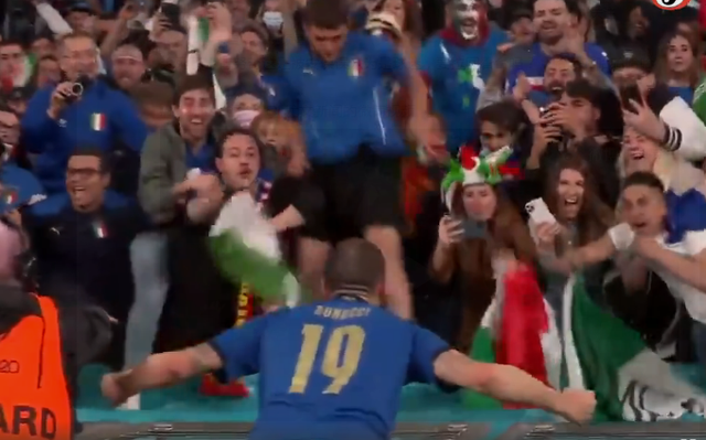 北京时间7月7日凌晨,意大利通过残酷的点球大战,击败了西班牙,闯入到最终的决战时刻,赛后全队庆祝的时候,出现了有趣一幕,意大利老将博努奇在场边与球迷们呐喊互动,结果却被现场的安保工作人员误以为是球迷入场,要求回到看台,这一波操作瞬间让博努奇一脸懵。