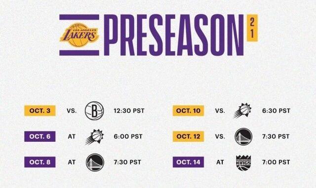 但一码归一码,北京时间的7月7日,湖人官方则是公布了球队2021-2022季前赛的赛程,他们将会在北京时间的10月4日迎来第一场对阵篮网的比赛,而在10月7日则是对阵本赛季淘汰自己的对手菲尼克斯太阳,在10月9日对阵老詹宿敌金州勇士,10月11日主场再战太阳,10月13日主场再战勇士,10月15日客场对阵国王,一共6场比赛,其中两次太阳、两次勇士、一次篮网、一次国王(均为北京时间),可见NBA官方为了流量,在季前赛就开始了发威啊!