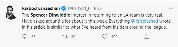 7月3日时有消息曝出斯潘塞-丁威迪对于重返洛杉矶有浓厚的兴趣,他此前已经决定拒绝执行下赛季的球员选项了,他希望得到一份大合同,湖人可以通过先签后换来交易得到他,也可以尝试清理薪金空间来追逐他。