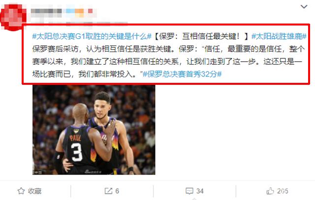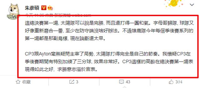 而对此,名嘴朱彦硕就表示:“这总决赛第一场,太阳队可以说是完胜, 而且还打得一团和气。字母哥归队, 球队又好像重新磨合一番, 至少在防守端没啥好办法。不过雄鹿队今年每个季后赛系列的第一场都是那副鸟样, 现在论断还太早。CP3跟Ayton毫无疑问主宰了局势,太阳队打得完全是自己的节奏。我怀疑CP3在季后赛期间有特别加练了三分球,效果非常好。CP3这样的高龄在总决赛第一场表现得如此之好,求胜意志溢于言表。”