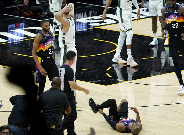 太阳队在总决赛的对手是在东部淘汰了热火队和篮网队两大劲敌的雄鹿队,正值壮年的雄鹿队三巨头字母哥、米德尔顿和霍乐迪对决老的老小的小的太阳队三叉戟保罗、布克和艾顿,这也是不少球迷赛前看好雄鹿队争冠前景的原因,但是在总决赛首场比赛当中,保罗用自己杀人诛心的表现摧毁了雄鹿队,赛后球迷也送给了圣保罗割鹿刀的美名,盛赞他用优异的个人表现让争冠大热门雄鹿臣服脚下!