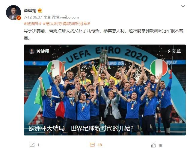 欧洲杯决赛,意大利点球大战击败英格兰夺得队史第二座欧洲杯冠军,著名解说员黄健翔发布了长篇文章评价本届欧洲杯。