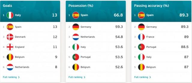 直播吧7月12日讯 随着意大利点球击败英格兰拿到本届欧洲杯冠军,这项赛事也落下帷幕。今日,欧足联在官方网站上公布了欧洲杯各队的主要数据排行,其中,意大利攻防两端数据都很亮眼。