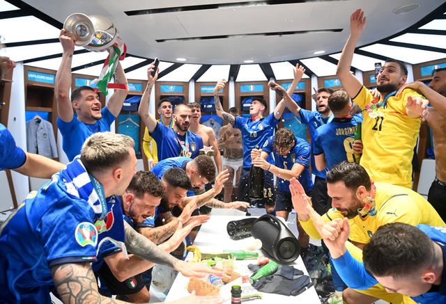 意大利全队在更衣室庆祝。意大利总理德拉吉:意大利队在主帅曼奇尼的带领下展现了无与伦比的团结精神和个人能力,欧洲杯冠军奖杯在53年后终于重回意大利。