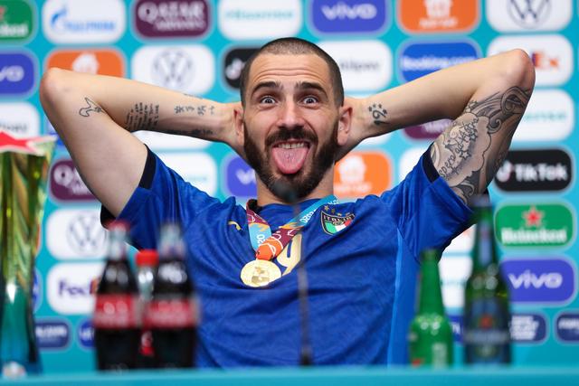 博努奇又来了瓶啤酒。意大利队长基耶利尼:我们配得上冠军,从五月初开始我们就说要夺冠,最后我们配得上荣誉,所有意大利人都值得夺冠。感谢三年来团队的每一个人,我们也要把冠军献给在家看球的球员。
