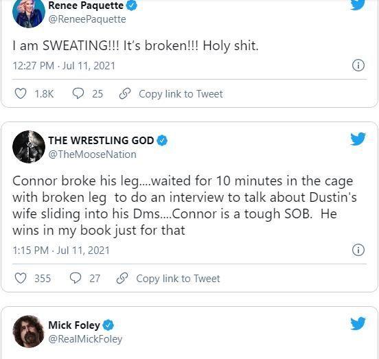 AEW的两个潜力新星都表示吓得马上自己检查一下自己的脚裸,和称没有人想见到这样的事发生!康纳·麦格雷戈和达斯汀·普瓦里耶的最后画面当然是出乎意料的,虽然很多人觉得这对组合显然对钻石有利,但总是有不同的意见。许多人通过社交媒体分享了他们的反应。双方的支持率都很高,许多人都预测了这场战斗可能会如何结束。职业摔角和综合格斗有很多共同之处,所以毫不奇怪会有很多职业摔角手分享他们对比赛结果的反应和祝福。