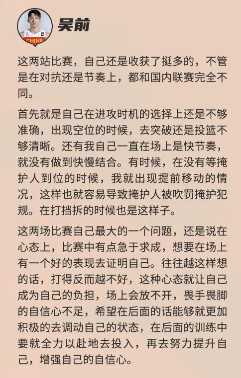 从内容可以看到,吴前是涉及到自身的低迷,给出4点原因,其中涉及到更多还是面对国际比赛的强度里面,与联赛完全不一样的对抗和节奏,自身很难把联赛时期的打法,无缝连接到国际比赛里面,这也是目前男篮现状,从沈梓捷,赵继伟,张镇麟等人,在联赛当中都是具备独当一面的本土球员,但是在国际比赛里面,却是很难打出自身的特点,甚至一半的水平都无法展示出来,埋藏太多无奈。
