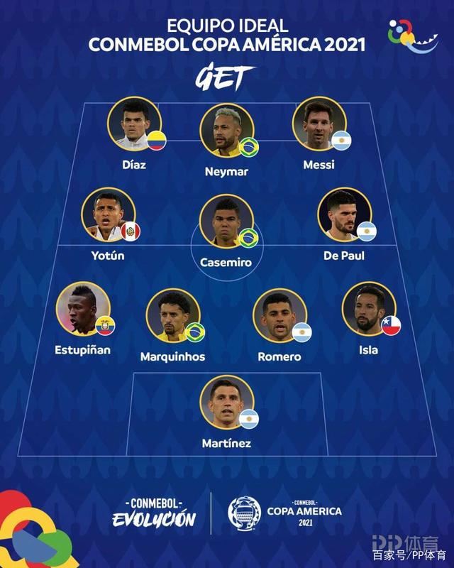 北京时间7月13日傍晚,南美足联公布了2021年美洲杯的最佳阵容,获得冠军的阿根廷成为最大赢家,共有4名球员入选,分别是门将马丁内斯、后卫罗梅罗,中场德保罗以及头号球星梅西,巴西也有3人入选,分别是马尔基尼奥斯、卡塞米罗以及内马尔。