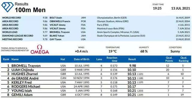本次9秒98(+0.4m/s)的成绩0风速硬实力只有10秒00,比起之前9秒77、9秒80的成绩相去甚远,究其原因,小编以为一方面是尤金的跑道条件较好,美国本土选手更加熟悉,适应性更好,另一方面是因为每个人状态有起伏,但也证明了布罗梅尔、罗尼贝克、科利尔三人在美锦赛中跑出9秒80+的成绩并不是常态。