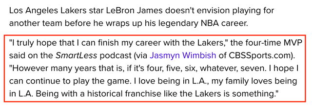 作为湖人当家巨星的勒布朗-詹姆斯希望自己职业生涯结束之前都为湖人效力: