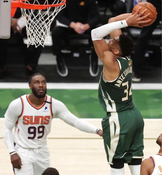 太阳对位上的吃亏,其实不止防字母这一个点,事实上,在系列赛开始前,我设想中的,雄鹿最可能拿到对位优势的球员是大洛和霍乐迪,因为他们在比赛开始阶段就有对位上的优势。随着系列赛深入,雄鹿逐渐玩明白之后,你会发现他们随处拥有的体型优势在不断发挥作用,比如佩恩被霍乐迪、米德尔顿不断惩罚,塔克挤开布克摘板,波蒂斯出场就能拿到篮板,大洛碾着大桥定点突破等等。