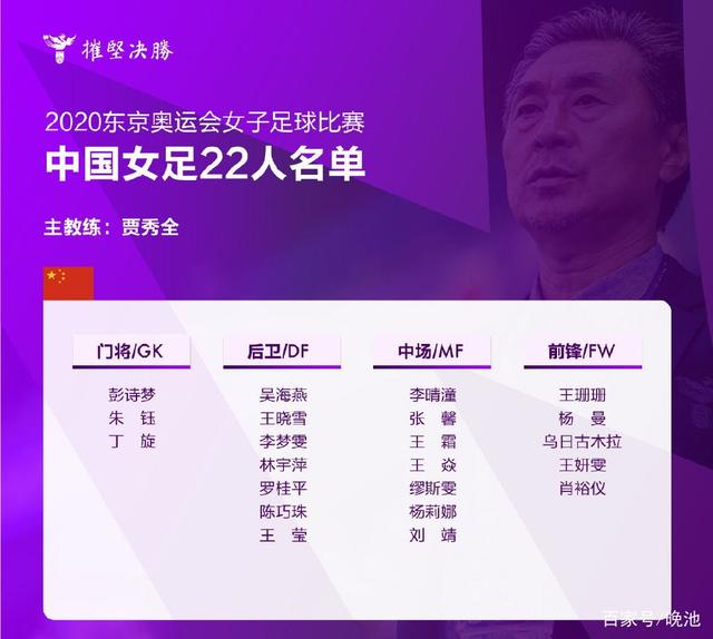 此次出战小日本东京奥运会的中国女足22人大名单为:吴海燕(队长)、王霜、王珊珊、彭诗梦、王晓雪、林宇萍、王焱、罗桂平、杨莉娜、张馨、李梦雯、缪斯雯、朱钰、王妍雯、杨曼、刘靖、李晴潼、乌日古木拉、肖裕仪、丁旋、王莹、陈巧珠。与巴西、荷兰和赞比亚同分在F组,另外两个小组中,E组是东道主小日本女足和加拿大、英国和智利,G组是瑞典、美国、澳大利亚和新西兰。