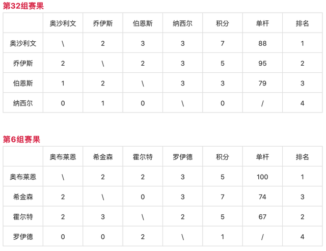 第6小组的进程十分复杂,两轮过后。希金森1胜1平处于领跑位置,霍尔特和奥布莱恩的战绩均为2平。最后一轮,霍尔特3-0击败希金森,后者率先出局。奥布莱恩则在最后一战中完成“极限操作”,他以3-0的比分击败罗伊德,进而在积分、净胜局与霍尔特完全相同的情况下,凭借此前打出的单杆100分,力压霍尔特的单杆67分,拿下小组第一,晋级第二阶段。