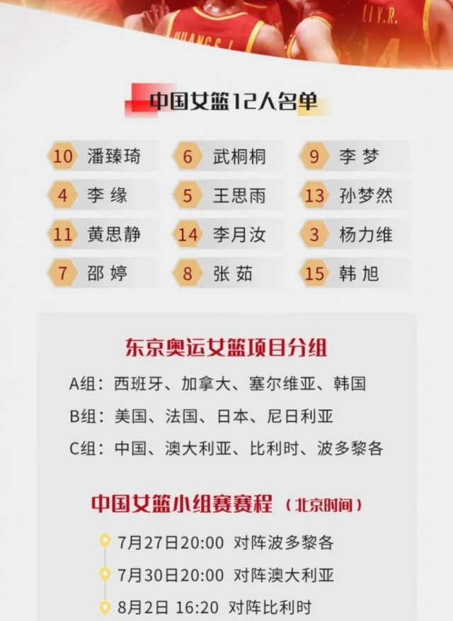2021年东京奥运会还是有篮球比赛可以看的,虽然中国男篮未能获得参赛资格,但我们可以看女篮和男子三人篮球啊,根据消息:男子3人篮球的最终名单已经确定,他们分别是胡金秋、高诗岩、颜鹏和李浩南。而女篮这边,赛程也已经出炉,我们这次被分在C组,同组的球队分别是:澳大利亚、比利时和波多黎各,具体赛程如下: