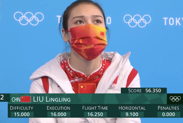 最后一个出场的是刘灵玲,她的队友朱雪莹表现十分出色,刘灵玲也同样不甘落后,前屈三周180,后两周360,后屈两周180,前屈两周540,直两周720等动作完美结束,稳稳落地。刘灵玲的动作完成得同样非常出色,最后得到了56.530的高分,获得了本项比赛的亚军!最终,中国姐妹花包揽该项目的金银牌!