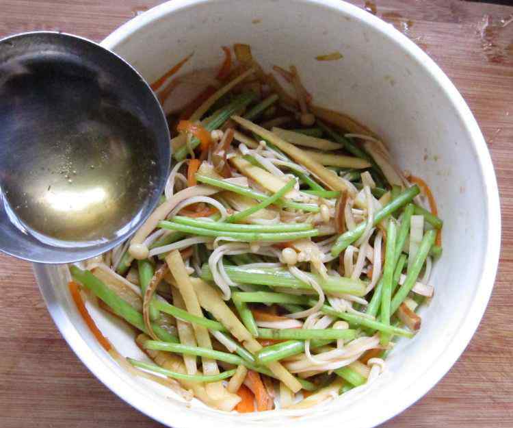 9 关火,马上把油淋在拌好的菜里拌匀后即可。
