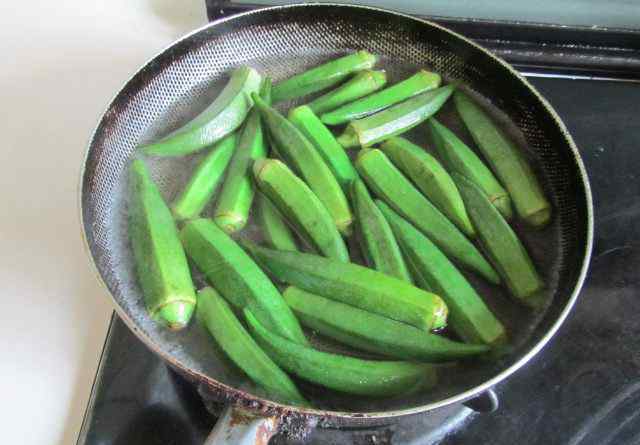 7 再将锅烧热, 放入少量的油, 下入黄秋葵和红辣椒圈一起翻炒;