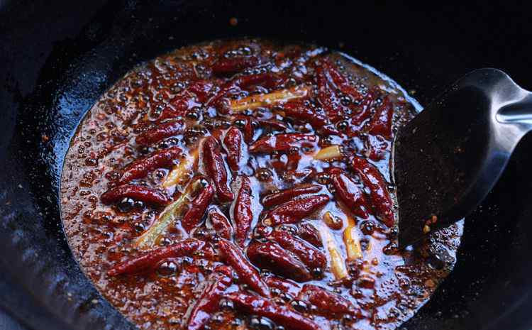 7 锅里倒入适量的油,烧至5成热,下入葱段、干辣椒,花椒,慢慢炒出香味。