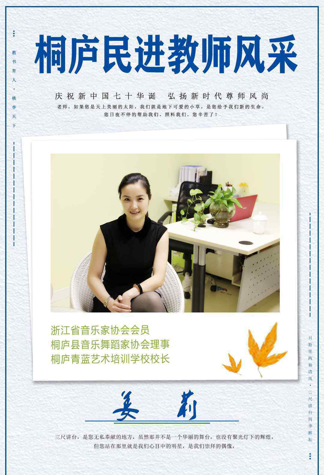 姜莉,民进会员,桐庐新青年联谊会理事,浙江省音乐家协会会员,桐庐县音乐舞蹈家协会理事,桐庐青蓝艺术培训学校校长。曾获得省文化厅“千名群众文艺骨干”“桐庐县音乐骨干教师”、 “桐庐县教坛新秀”、 “桐庐县优秀教师”等荣誉称号。多次参加杭州电视台生活频道“欢乐农家大行动”,获得市一二等奖;参加浙江省戏剧小品大赛获银奖。自2007年创办艺术学校以来,积极开展各类艺术活动,培养了众多具有艺术特长的学员,数百名学员在国际、全国以及省市县获得了优异的成绩。