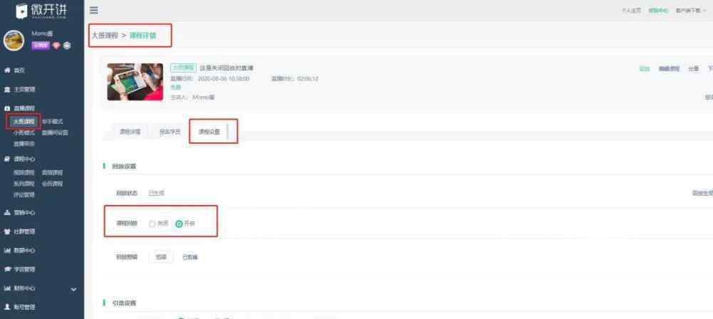 同时启动了回放切换功能,增加了讲师的权限,允许讲师在后台保留课程回放,但限制了学生观看。直播课程用这个开关作为营销引流,也可以达到不同的效果;随着回放设置功能的增加,微课也针对更多的课程进行了升级:常规上架、隐藏和停产功能,制作课程可以根据自己的实际情况进行相关设置。