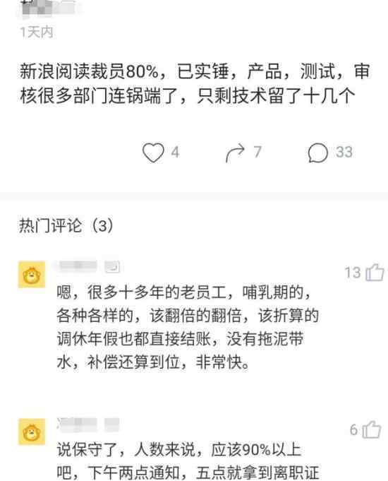 近日有网友爆料称,新浪阅读业务线裁员90%,下午2点通知,5点领离职证。赔N+1,双倍年假,现场结算,就地解散。有微博员工表示,不仅新浪读书,其他部门都下岗了。目前新浪官方还没有回应。