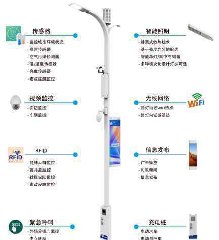 智能路灯是一种集成各种信息设备技术创新和复合应用的智能路灯产品。整个智能路灯柱包括路灯照明控制系统、WIFI天线基站、视频监控管理、广告屏广播控制系统、城市环境实时监控、紧急呼叫系统、充电桩系统、井盖监控系统。