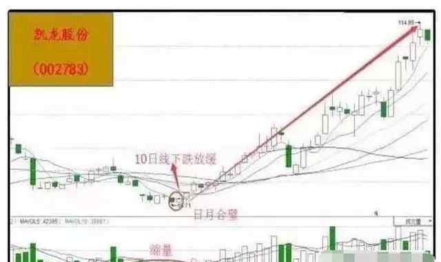 如上图,同股价下跌一段时间后,成交量萎缩。第二天停止下跌反弹,10日均线跌幅放缓。k线在这两天形成了“日月结合”。之后股价继续上涨,留下了一个大的波段市场。