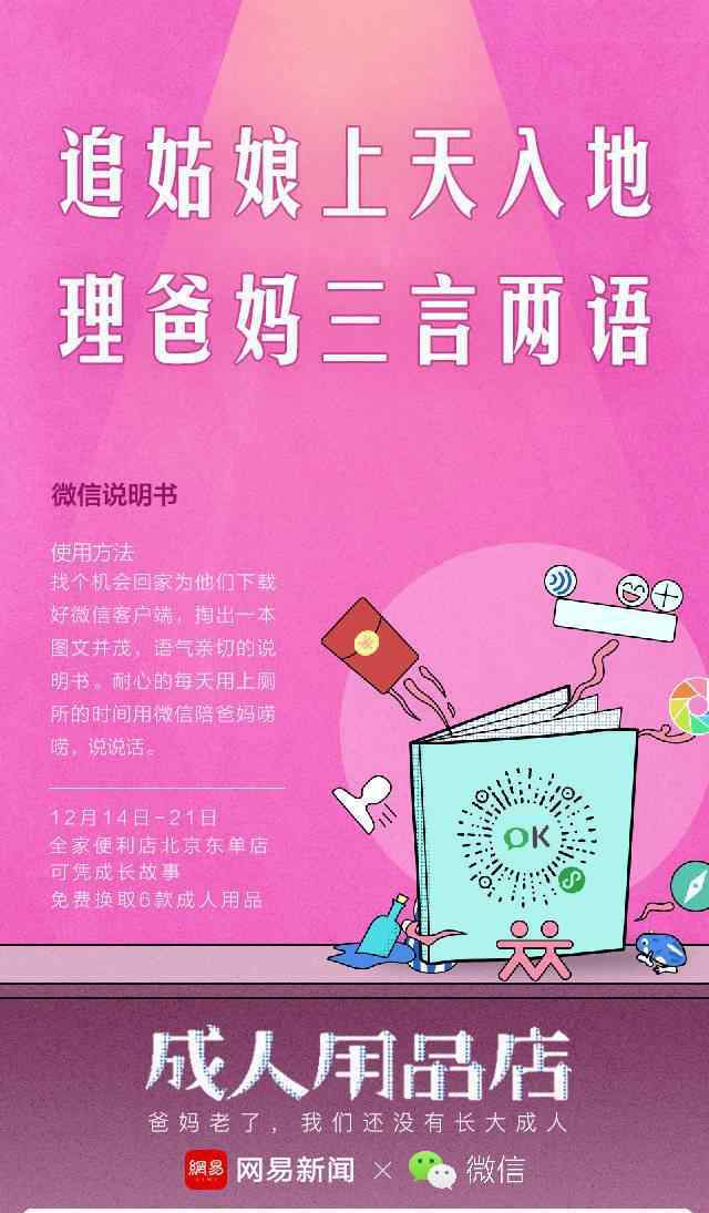 今天说的成人用品店是网易和familymart在北京开的“正品”成人用品店。专门为90后设计,销售促进代际关系的成人商品。用户只要去北京东单店,familymart参加活动,分享成长故事,就可以免费获得各种有趣的成人用品。