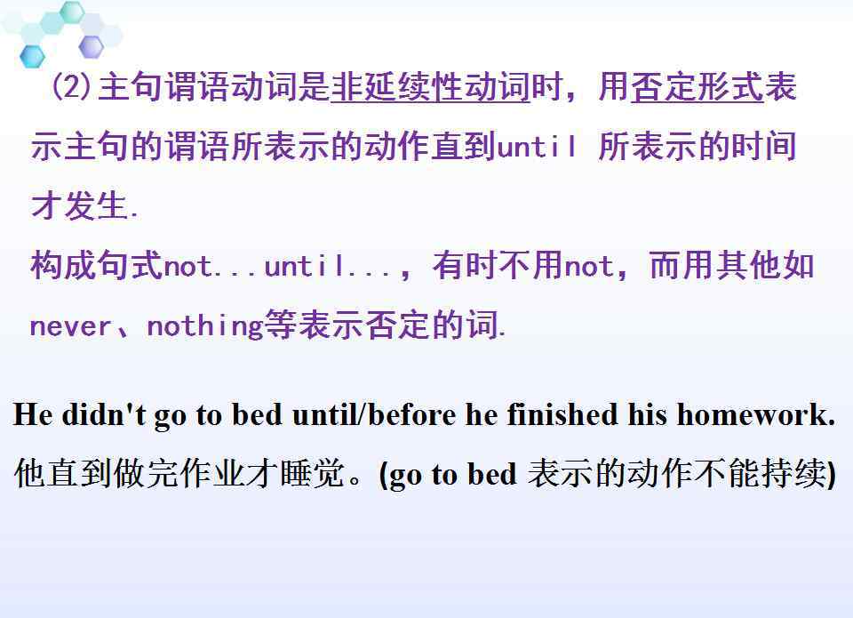 1.主句为持续性谓语动词时,肯定句和否定句都可以,但意义完全不同。肯定动作终止,而否定动作开始。