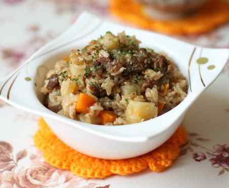 将土豆和米饭炖至粘稠,用豆沙调味,用香油调味。这碗卤饭吃不饱。
