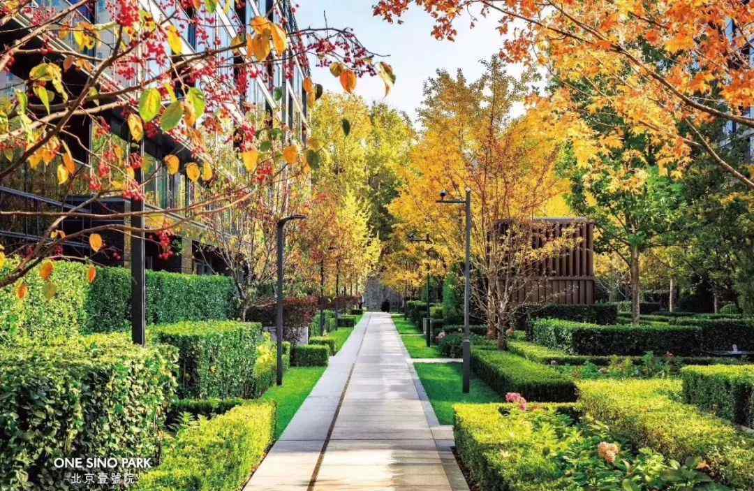 北京一号院的夏日风景是由不同层次的绿色构成的像素花园。人们更注重规则的灌木和点缀其间的花朵,这在现代是浪漫的。